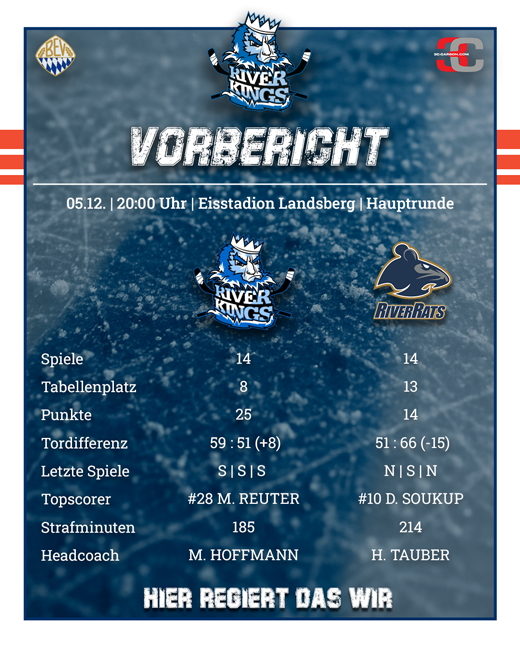 Nachdem das erste Heimspiel gegen Geretsried wegen einer defekten Scheibe an der Spielfeldbande abgebrochen werden musste, kommt es nun am Freitag um 20:00 Uhr im heimischen Stadion zum erneuten Duell mit dem Team aus dem Oberland. Am Sonntag starten die Riverkings dann in die Rückrunde mit dem Heimspiel gegen Dingolfing. Dabei erhalten Groß und Klein ab 17:15 Uhr Besuch vom Nikolaus, ehe um 18:00 Uhr das Spiel beginnt. Kinder bis zwölf Jahre haben dabei freien Eintritt.