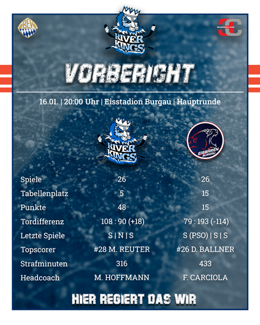 Am Freitag reist die Mannschaft von Trainer Martin Hoffmann zum Tabellenvorletzten nach Burgau, ehe am Sonntag, den 18. Januar, um 18:00 Uhr die Mammuts aus Schongau zum Blaulichtspiel im Landsberger Eisstadion zu Gast sind. Wenn die Riverkings als aktueller Tabellenfünfter weiter um die direkte Play-off-Qualifikation mitspielen wollen, müssen an diesem Wochenende Punkte eingefahren werden.