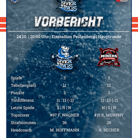 Im ersten Spiel des Wochenendes traten die Riverkings auswärts zum Derby bei den Miners in Peißenberg an. 1.600 Zuschauer, darunter rund 400 Landsberger Fans, sorgten für einen würdigen Rahmen und eine fantastische Stimmung.