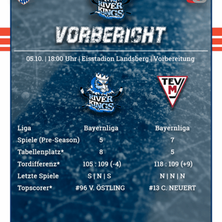 Im letzten Vorbereitungsspiel auf die anstehende Bayernliga-Saison 2025/26 treffen die Riverkings auf einen weiteren Favoriten der Liga – den TEV Miesbach.